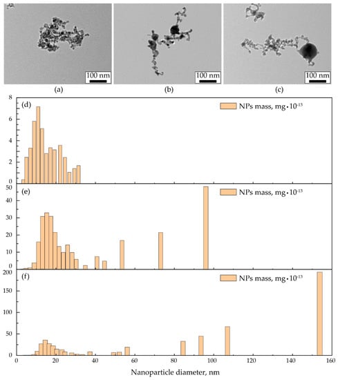 In experiments with the UDP, we analyzed the dispersed composition of aerosol NPs by TEM and measured the mass loss of the cathode and anode. According to a series of TEM images of NPs (for example, Figure 13a–c) for each of the three variants of the electrodes’ ends arrangement, the mass-size distributions of NPs (Figure 13d–f) were determined. It indicates that with an increase in the degree of electrodes asymmetry the NP agglomeration increases. In the case of electrodes parallel ends, a large number of isolated NPs were observed (Figure 13a). In the case of the electrodes’ ends arrangement at the angle of 3°, the particles mainly formed small agglomerates. At the angle between ends of 10o, the energy release density in the discharge became sufficient for the fusion of NPs with the necks’ formation specific for strong aggregation. At the same time, in all cases, a great number of NPs with sizes of 2–5 nm were observed, which did not make a significant contribution to the mass distribution. However, we have not detected NPs larger than 40 nm in these experiments, probably due to an order of magnitude lower energy release in the spark gap compared to similar experiments with the ODP.