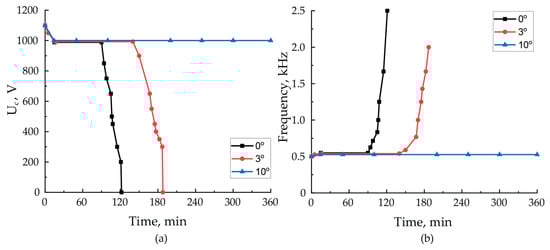 Figure 9. The dependences of (a) the capacitor charging voltage and (b) the frequency of capacitor discharges for the case of synthesis with the UDP for electrodes’ ends arranged in parallel and at the angles of 3° and 10°.