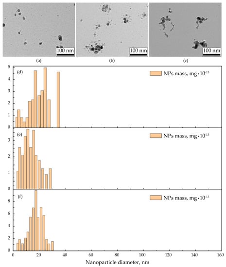 Figure 13. (ac) TEM images and (df) mass-size NPs distributions for the cases of NP synthesis with the UDP for electrodes’ end faces arranged (a,d) in parallel and at angles (b,e) 3° and (c,f) 10°.