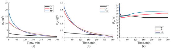 Dependences μ ( t ) , m e ( t ) and   P d ( t ) calculated from experimental data for the three cases of the degree of electrode asymmetry are shown in Figure 14. The electrical power P d ( t ) entering the spark gap varies slightly with time except for the first 5 min, during which the working area is heated by SDs. However, the mass loss rate and the energy efficiency are described by steeply and monotonically decreasing functions.
