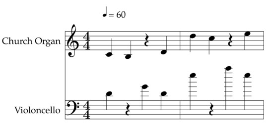 This is interpreted from left to right as: change the tempo to “quarter equals 60”, apply the dynamic mezzo-forte, play the current note on instrument 2, rise the pitch seven steps on the given scale and finally play the resulting note on instrument 2. As before, Figure 2 shows the resulting score.