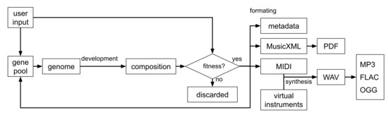 - Gill, S. A Technique for the Composition of Music in a Computer. Comput. J. 1963, 6, 129–133. [Google Scholar] [CrossRef][Green Version]