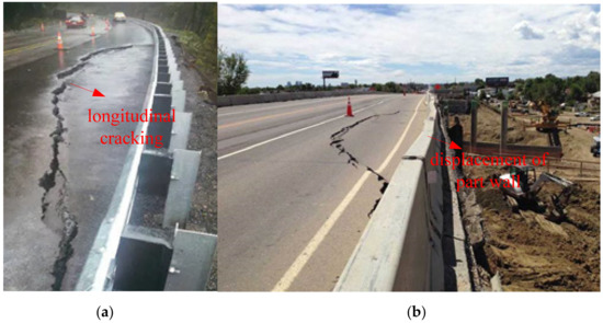 Retaining wall has been widely used in transportation, water conservancy, and construction projects [1]. However, part of the retaining wall might produce differential movement due to the influence of different stiffness of wall, embedding depth, foundation overload, and the constraint of the wall end [2]. According to Fang et al. [3,4], the displacement pattern of the retaining wall was simplified into three types: translation (T), rotation around the top (RT), and rotation around the base (RB). The movement of the retaining wall can lead to subgrade disasters such as longitudinal cracking, settlements, and slip of embankment, as shown in Figure 1 and further cause serious engineering accidents. In realistic roads, there is usually a part of the retaining wall producing displacement along the longitudinal road. However, previous research has mainly focused on the movement of the entire longitudinal retaining wall [5], which is inconsistent with the reality. The partial moveable wall could heavily affect the adjacent stationary wall, but there are still only a few studies concentrating on the influence of the partial displacement of the retaining wall [6].