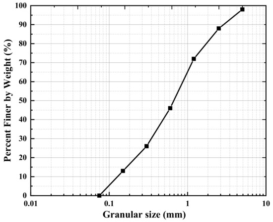 Dry sand from the Yellow River, Shandong Province, China was used as the filler in the test. The grading curve of the sample sand is shown in Figure 4. Before the test, the sand was dried in a drying room for over 24 h to eliminate the influence of moisture content on soil strength. The effective particle size d10, and constrained diameter d60 and d30 of sample sand were 0.12 mm, 0.82 mm, and 0.36 mm, respectively. The uniformity coefficient of the sample sand was 5.47 and the coefficient of curvature was 1.32. According to the Standard for Geotechnical Testing Method (GB/T 50123-2019) [29], the fineness modulus MX was 2.435, which means that the sand belonged to medium sand. The physical properties of the sand samples are given in Table 1.