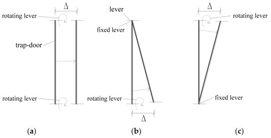 The sand around the stress detectors was tamped with a rubber hammer to minimize the impact on the stress detectors. To control the movement precisely, the displacement was applied by rotating the levers. A diagram of multi-stage movement in three displacement modes is shown in Figure 5. The trap-door could move outward by rotating the lever and rotating the lever; one lap could achieve a 0.5 mm distance of the trap-door. Therefore, the distance can be controlled by the number of rotating laps. Thereby, rotating the top lever and fixing the bottom lever corresponded to the RB mode and rotating the bottom lever and fixing the upper lever achieved RT mode. Rotating both the top lever and bottom lever for the same laps could realize T mode. Regarding the movement level as N, the N-level displacement amount can be referred to as (mm) with every 0.5 mm increment.