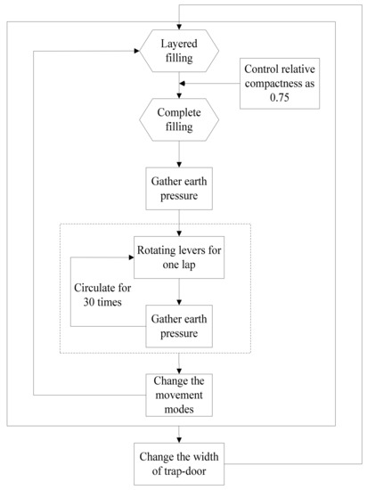 After each movement step of the movable plates, the earth pressure was measured by the Donghua monitor software shown in Figure 3 when the number of stress detectors was stabilized. All the test conditions are listed in Table 2 and the experiment process is shown in Figure 6.