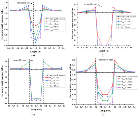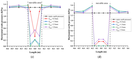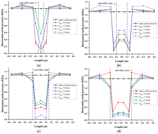 The distribution of the lateral earth pressure along the X axis in RT mode is plotted in Figure 13. Similar to T and RB modes, when the trap-door produced an active displacement of rotation around the top, the earth pressure behind the fixed wall slightly increased and exceeded the static earth pressure. However, the earth pressure on the trap-door decreased greatly with the minimum value close to 0. However, it should be mentioned that the minimum lateral soil pressure under some displacement (i.e., the displacement in Figure 13b–d) was not located at the middle of the movable plates, but the positions of a side edge. This illustrated that the ‘secondary soil arching effect’ also existed in RT mode.