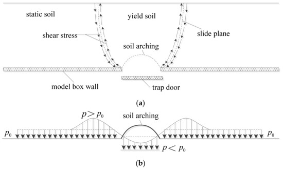 Illustration of the principle of soil arching effect: (a) Diagram of forming the horizontal soil arching. (b) Diagram of stress redistribution.