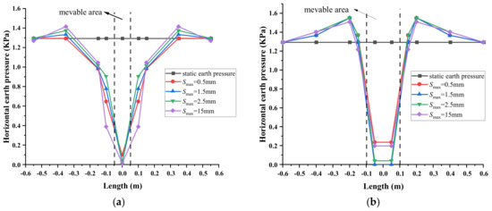 The primary reason accounting to this phenomenon is uneven deformation of the soil, which meant that the deformation of soil behind the movable plates was larger than that behind the fixed wall. The horizontal soil arching effect was thus generated in the soil body [6], as shown in Figure 9a. The soil arching effect can redistribute the soil stress and can fully mobilize the shear strength. The shearing resistance caused by uneven displacement reduced the earth pressure on the yielding soil and increased the pressure on the adjoining stationary part. The redistribution of earth pressure behind the movable plates and fixed wall, as shown in Figure 9b, revealed that the earth pressure behind moveable plates would be lower than the static earth pressure, . However, the earth pressure behind the fixed wall would be higher than the static earth pressure, p0.