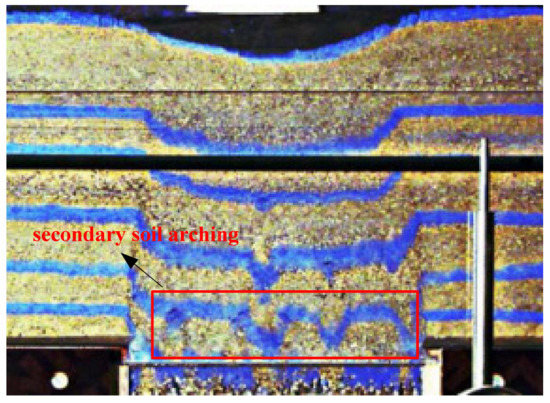 The distribution of the lateral earth pressure along the X axis in RB mode is shown in Figure 10. Similar to T mode, the variation of earth pressure behind the moveable plates and fixed wall along the X axis was also like an inverted bell, which showed that the horizontal soil arching also existed in RB mode. However, it should be noted that the minimum value of the lateral soil pressure behind moveable plates was not located at the middle width of the trap-door but near the side of the moveable area. In comparison with Figure 8, there were three peak values of lateral earth pressure in this movement mode. The peak pressure at the middle trap-door in RB mode was much higher than that in T mode. It can be explained that the soil in the width-range of the trap-door might produce a ‘secondary soil arching effect’ that was derived from the experiment of Chevalier [20], as presented in Figure 11 and Figure 12. The secondary soil arching effect would dominate the stress redistribution of the soil between the ‘main soil arch’ and the trap-door. Therefore, the minimum lateral soil pressure was near the edge of the movable plates.