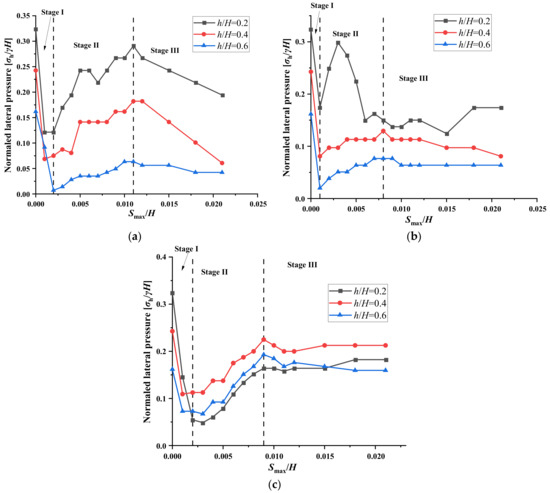 Stage I: Reduction stage of earth pressure behind the moveable plate. For any movement mode, the earth pressure behind the trap-door is reduced from the static pressure to the active pressure in this stage. As shown in Figure 14, the lateral soil pressure reached the minimal value when the displacement of the trap-door was about 0.1~0.2% H in the three modes. The limited displacement obtained from the test was similar to Fang [4] and Chen [30].