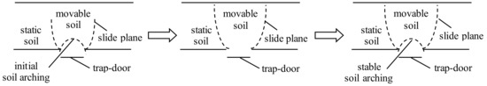 Similar to that in the vertical trap-door experiment, the above phenomenon of pressure variation could be explained by the theory of soil arching evolution [17,18,19], as shown in Figure 15. When the displacement of the trap-door was small, the initial soil arch formed and the earth pressure decreased to a minimum. At this time, the soil mass reached the active limit equilibrium state and the soil arching effect was fully exerted. After that, with the increasing displacement of the trap-door, the slide plane gradually extended to the interior of the soil. Then, the initial soil arch was destroyed and the earth pressure increased. Finally, a stable soil arch was formed again in the soil and the earth pressure gradually decreased to a stable value. Particularly, in addition, to the horizontal displacement of the soil, there was also an impact caused by gravity and different displacement modes, therefore the strength of the soil arching at various heights was disparate.