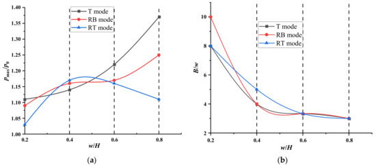 It can be observed from Figure 16a that the peak load acting on the fixed wall increased with the width of the trap-door expanding for T and RT mode. However, for RT mode, it increased when w/H was less than 0.43 and then descended gradually. The maximal value of pmax/p0 was about 1.37, emerging on T mode at w/H = 0.8. It is evident that the exertion degree of the soil arching effect was strongest in T mode, followed by RB mode, and was weakest in RT mode.
