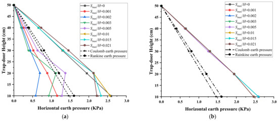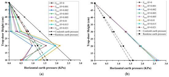 As shown in Figure 7, the coordinate of schematic diagrams of the trap-door test was determined and is discussed in the following. The center of the movable plates for each trap-door test was selected as the zero point of the abscissa. The earth pressure at the height of 30 cm was selected for analysis while the data at other heights were similar. The maximum distance of the trap-door was marked as Smax, the height of the trap-door was noted as H, and the width of trap-door was w, as shown in Figure 3. The coordinate diagrams in other displacement modes were the same. Because the load cells were only arranged on the semi-length wall, the earth pressure data on the other half length could be recorded symmetrically.