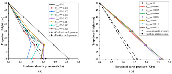 Compared with the condition of movement of the entire retaining wall, only the movable plates had a displacement in the horizontal trap-door test, while the surrounding box wall was fixed. Thus, it was evident that the horizontal soil arching phenomenon dominated the backfill performance behind the trap-door, making the earth pressure distribution different with traditional soil pressure.