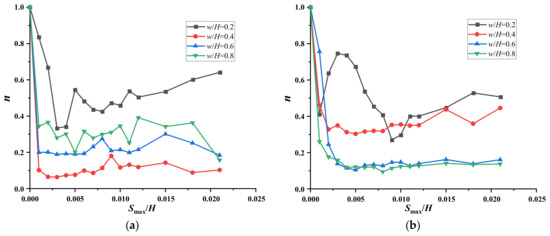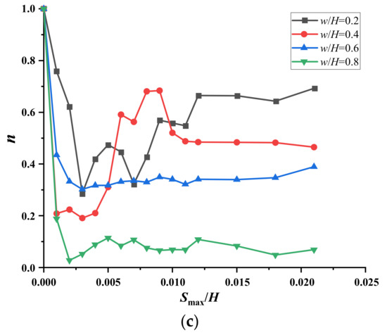 Analysis of the load sharing ratio n in Figure 21 showed that the maximal n of all displacement modes occurred at the 10 cm wide trap-door. The load sharing ratio had a minimum value at w/H = 0.4 in T mode while w/H = 0.8 in RT and RB modes. The minimal load sharing ratio usually tends to be sought because the lower load sharing ratio showed that the moveable wall undertook less load, which is favorable to the stability of retaining wall. It is clear from the figure that n reached the minimum at a specific displacement and did not decrease continuously as displacement increased. The minimum was about 0.1 in the three modes.