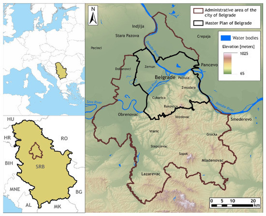 The MPB is part of national spatial planning legislation which shapes the processes of spatial development and represents a strategic development plan for large cities in the Republic of Serbia. The MPB region for the capital of Serbia, Belgrade, covers an area of 778.52 km2 and extends to two distinctly different, clearly separated relief units (Figure 1). The northern part is a distinct lowland area, while the southern part is a rugged, typical hilly–mountainous relief. The natural boundary separating the two relief units are the Danube and Sava Rivers, which determine the microclimate of the city and represent the recipients of urban watercourses. The territory of the MPB has an average altitude of 120 m above sea level (range from 70 to 500 m above sea level) with a dense hydrographic network in the hilly–mountainous area and a complex system of drainage canals in the lowland area. Numerous occasional watercourses in the southern part of the MPB are one of the factors influencing the genesis of frequent torrential floods. The geological structure of the terrain is complex and represents the dominant direction of pedogenesis and the occurrence of certain soil types, with the largest share of chernozem, cambisols and alluvial sediments [38,39].