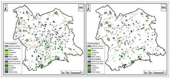 Figure 2. Samples of the polygons for training and land cover validation for 2001 (a) and 2019 (b).
