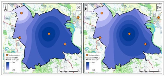The spatial distribution of factor R is shown in a raster form with a spatial resolution of 30 m. The average value of factor R is 731.19 MJ·mm·h−1·ha−1·y−1, and a value range from 693.99 to 764,907 MJ·mm·h−1·ha−1·y−1 recorded in the central part of the MPB for the first period (Figure 4a).
