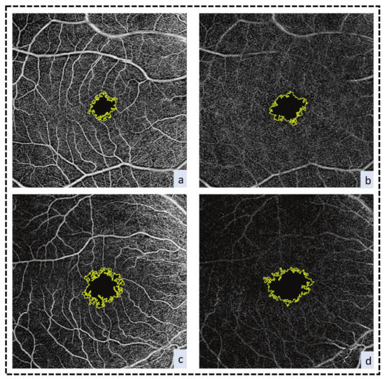FAZ enlargement. (a) SCP for a normal subject, (b) DCP for a normal subject, (c) SCP for a diabetic patient, and (d) DCP for a diabetic patient.