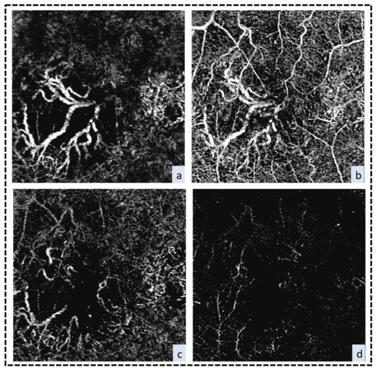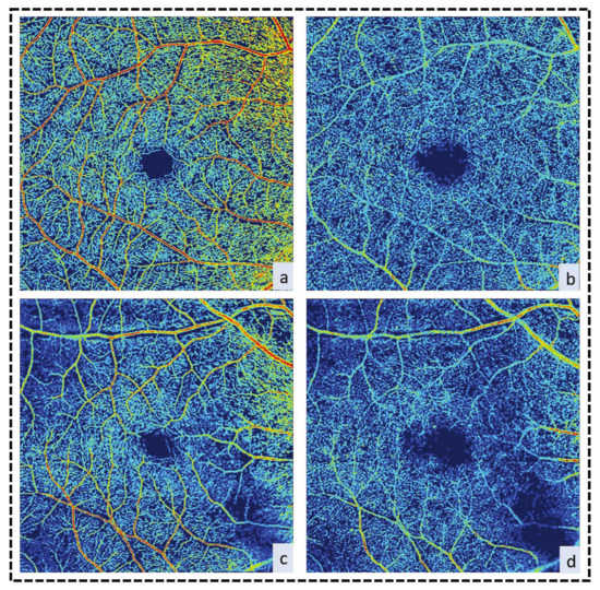 Rosen et al. [71] found that perfused capillary density (PCD) is elevated in diabetic subjects with no DR as compared to healthy subjects, and they suggested that PCD can be used as a preclinical biomarker of diabetic microvascular disease. The different findings between these studies may be related to the specific segmentation method employed. Rosen et al. [71] selectively isolated capillaries from non-capillary blood vessels, and their results revealed increased perfused capillary density. They suggested that this was an autoregulatory response to increased metabolic demand. Other authors [31,46] have not done that, which may explain their results of decreased vessel density in DCP.