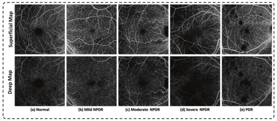 Kim et al. [60] found that vessel density is reduced progressively in both DCP and SCP with severity increase of DR. They reported that the density of vessels in SCP was mm in normal healthy controls then reduced to mm in diabetic patients with mild NPDR, then reduced to mm in diabetic patients with severe NPDR and then reduced to mm in diabetic patients with PDR. They also found that vessel density in DCP was mm in normal healthy controls, then reduced to mm in diabetic patients with mild NPDR, then reduced to mm in diabetic patients with severe NPDR and then reduced to mm in diabetic patients with PDR. Figure 3 shows a progressive reduction of vessel density with the advancement of the stage of DR.