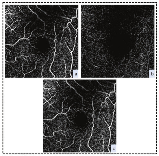 Retinal vein occlusion (RVO) is ranked the second most common vascular disorder in retina after DR with significant visual impairment. Hypertension, open-angle glaucoma, smoking, thrombophilic disorders and diabetes are among the basic risk factors of RVO [105]. Macular ischemia or macular edema is the leading cause of central vision loss [106] in addition to its neovascular complications, including neovascular glaucoma and vitreous hemorrhage [107]. Figure 5 presents the capillary non-perfusion in DCP and SCP of RVO patient.