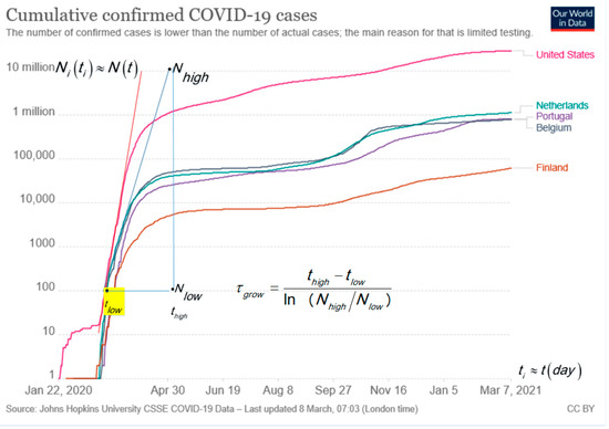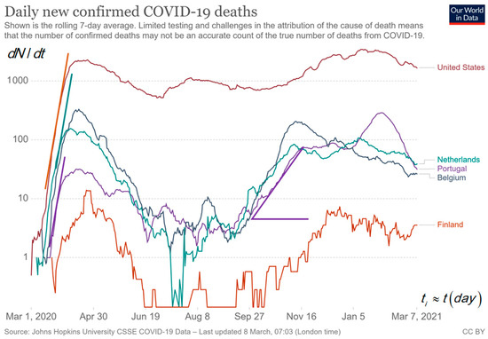 The typical monotonic increasing cumulative curves presented in the log–lin are convenient to visualize the situation in one plot for large and small countries and go asymptotically to the limiting value of M. The exponential growth is in log–lin, a straight line as shown by the tangent lines in Figure 1 for USA, Portugal, Belgium, the Netherlands and Finland. The slope analysis of the tangent line in Figure 1 follows the characteristic time, τgrow, with the time difference, , expressed in days, d, and ln as the natural logarithm [6]. For confirmed cases of COVID-19, in most countries, it holds that for the run up to the first peak: . The surprising result is verified, among others, for Ireland, United Kingdom, Italy and Germany, not shown in Figure 1 for clarity. The small difference, e.g., τgrow = 5.68 d for Italy and τgrow = 4.73 d for the Netherlands, can point to better handling by the Italian authorities [3]. The tangent line for the USA indicates a steeper exponential growth with .