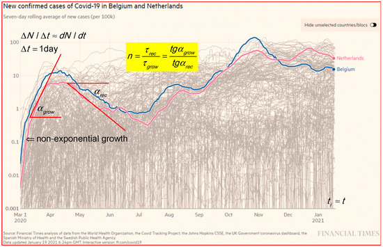 The epidemic curves in Figure 2 for new confirmed cases per day, d, in log–lin for Belgium and the Netherlands [1] show an exponential growth in the run up. In less than one year, the Belgium and the Netherlands curves show four to five peaks. Figure 2 shows that the growth rate (1/τ) in the first peak (steeper slope) is faster than for the second peak (slower slope), e.g., for Belgium and the Netherlands: first peak is and second peak is .