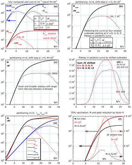 The simulations in Figure 4a–f are without a parameter change during the outbreak. In Figure 4a, the sum of 103 islands is compared with the city situation (m = 1). We assume that all outbreaks start at the same time. This is much earlier than for the city situation with the peak at t/τ = 12.9. The maximum for one island, τN′max(1/m), is 103 lower than the sum and comes earlier than in the city situation. The tinf/τ and τN′max(1/m) for m = 1 and 103 are indicated in the inserted table. The blue arrow indicates that the sum of all subgroups starts at a higher N and τ × N′ at low t/τ compared with the city situation. Real data often show such a steep increase at the beginning of the pandemic curve because , as shown in Equation (12). The start of the infection at random times is more realistic. Therefore, in Figure 4b,c, we simulate the effect of four isolated outbreaks with time intervals of t/τ = 3 and 4, respectively. Patchy outbreaks result in a plateau for the epidemic curve of the sum of the four subgroups. The plateau is broader and lower if the intervals are slightly larger. Figure 4d summarizes the epidemic curves in (b) and (c) in a lin–lin plot.