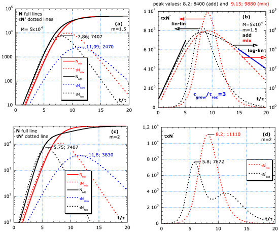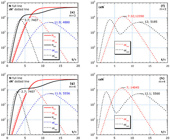 The full lines in the simulations represent cumulative numbers, . The dotted lines represent the new cases per day, d (), multiplied by the characteristic time, τ, versus the relative time scale, t/τ. This makes results more general. If τ = 10 d, then the absolute time scale is found by multiplying the x-axis values by 10 and dividing normalized epidemic curve values by 10. The simulation in Figure 4a–d have an arbitrarily chosen value M = 105. This means that for N0 = 1, M/N0 = 105 and tinf/τ = 12.86. If the reference τ of the slow group is 10 d, and the epidemic curve is about new hospitalizations per day, then a value of τN′ = 500 should be read as 500/10 or 50 patients per day, d. In addition, if people stay in the hospital for 10 d on average, then we need a capacity of 500 beds for the newcomers. A stationary state holds: ‘population size’ is equal to the ‘birth rate’ multiplied by the ‘average lifetime.’