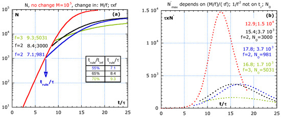 The effect of imposing stronger rules (or a very effective 66.6% vaccination degree) at different times during the process assuming: are compared to no change in red lines. Time lag is not considered. (a) The cumulative number, N, at the introduction of the rules, the values: trule/τ;N0. (b) The flattening of the epidemic curve (multiplied by τ) of the scenarios in (a) with the normalized time at the maxima, tmax/τ, its normalized value , the f-value and N0.