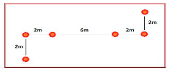 Representation of the 20 m figure sprint. The figure shows the distance in meters (m) separating the six obstacles (cones, red circles).