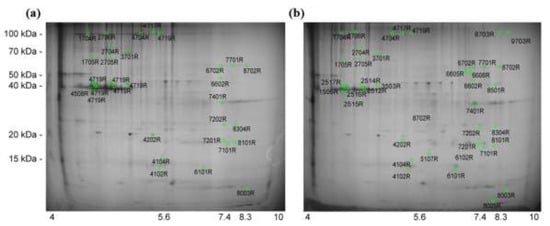 Proteomic techniques help us to understand what happened inside the cells after stress occurred. Previously, we compared global proteome profiles and the expression pattern of defense-related genes in Chinese cabbage when infested by Myzus persicae and Plutella xylostella [28]. Approximately 1600 protein spots were separated, of which nearly 160 showed reproducible changes in expression. 2D-PAGE (24-cm IPG strips) was combined with silver staining to investigate differences in the proteomes of the PH3-S and PH3-R strains of rice weevil. The relative spot volumes and gray values of the protein spots were detected using PDQuest software (version 7.0). All 2-DE gels showed a broad distribution of spots in a pI range from 4.5–8.5 and a mass range of 14–150 kDa. In total, 1589 protein spots in the PH3-S (Figure 1a) and PH3-R strains (Figure 1b) were identified. Image analysis software was used to identify aligned spots whose mean intensities differed by at least two-fold between the PH3-R and PH3-S strains. Quantitative analysis revealed 39 differentially accumulated protein spots in the PH3-R and PH3-S strains, of which the intensities of 19 protein spots were decreased and those of 20 protein spots were increased in the PH3-R strain of S. oryzae.