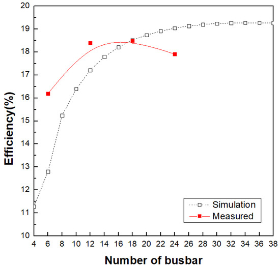Simulated values and measured values based on the number of busbars for c-Si solar cell.