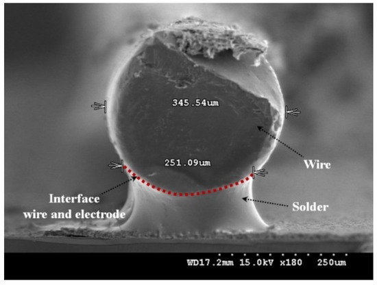 Figure 3 shows the schematic of the conventional rectangle-type busbar and wires. Based on literature research [21], it was confirmed that the effective shading area was observed differently by the light incident on the wire. For a wire, the incident light is directly reflected on the cell surface, and the effective shading area is reduced to approximately 70% of the actual area. In area b, the incident light from the wire is reflected on the module glass, when the refractive index of the glass used in the module is 1.5. The effective shading area decreases to approximately 35%. In c, the light reflected from the round wire is reflected back to the module glass; however, the incident angle is larger than the total reflection angle, and therefore the light is divided into reflected and transmitted parts. Accordingly, the shading area of the wire is reduced, and incident light is vertically reflected by the wire, which is re-incident to the wafer surface. Contrastingly, incident light on the rectangular-shaped conventional busbar is less re-incident to the wafer surface. To measure the contact area between the wire and the finger electrode, a cross-sectional scanning electron microscope (SEM) image of the wire and the finger electrode was performed, as shown in Figure 4. The contact area between the wire and finger electrode was reduced by 70% of the wire diameter.