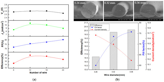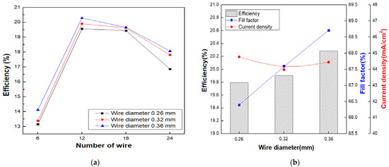 The change in the short-circuit current was small, and the fill factor was greatly improved as the diameter increased. Although the optical loss increases as the wire diameter increases, the short-circuit current loss is small. As the diameter of the wire increases, the series resistance component significantly decreases, thereby improving the fill factor [25,26]. In addition, the efficiency of the module was also affected by the number of wires, and the highest efficiency was achieved when the number of wires was 12. The lowest efficiency was observed when the number of wires was 6, and the efficiency started to decrease as the number of wires increased to 12 or more. Figure 9 compares the results obtained when the number of wires is large and small. When the number of wires was large, the length of the finger electrode between the wires decreased. Accordingly, the resistance of the finger electrode decreased, although the optical loss was owing to the increased shading area. Conversely, as the number of wires decreased, the shading area decreases and optical loss decreased; however, the length of the finger electrode between the wires increased, indicating that the resistance of the finger electrode increased [27,28,29].