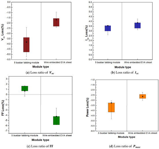 The cell/module characteristics of the tabbing module and the wire-embedded EVA sheet module were compared. Table 1 and Table 2 summarize the characteristics of the five-busbar tabbing module and wire-embedded EVA sheet module. Figure 11 shows the characteristic graph for the five-busbar tabbing module and wire-embedded EVA sheet module. For the expected power value of the 2 × 2-unit module, the maximum value of the module characteristics was calculated based on the sum of the Voc values of the four cells, the lowest Isc value, the average value of the fill factor, and the sum of Pmax. Table 2 lists the cell and module characteristics for the five-busbar tabbing modules, and Table 3 lists the cell and module characteristics for the wire-embedded EVA sheet module. For the FF (fill factor) value, the difference between the expected and measured values was confirmed. The reason for the decrease in the FF value in the measured value can also be explained by the increase in Rs. The FF can be expressed as a function of the series resistance and parallel resistance, and the series resistance can be changed by the front and rear electrodes. In particular, for the busbarless case, because the busbar, which is an important part of reducing the series resistance, is replaced or removed, the influence of the finger and the front structure on the total series resistance increases. The series resistance decreases from the expected value because of the influence of the resistivity of the wire and the contact resistance between the wire and the finger electrode, and the resistance of the ribbon to the string process of the module. The ratio of the difference between the calculated values and the measured value of power for the five-busbar tabbing module and wire-embedded EVA sheet module were 3.245% and 2.619%, respectively. As can be seen from Figure 11, it was confirmed that the power reduction characteristic of the wire-embedded EVA sheet module has a lower reduction rate of approximately 0.6% than the five-busbar tabbing module, and hence the loss when made from a cell to a module can be minimized. It was possible to manufacture a high-power module that sufficiently compensated for the disadvantages of the tabbing module.