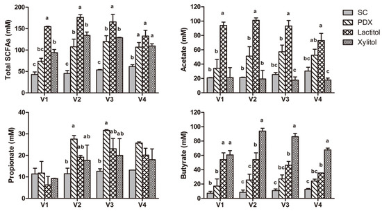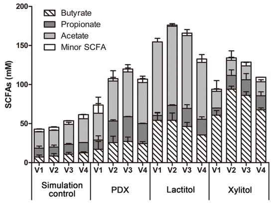 After the in vitro colonic fermentation, the composition of SCFAs was analyzed. SCFAs were produced due to the three substrates, but a small amount of SCFAs was also produced throughout the four vessels due to the carbohydrate components such as starch, inulin, guar gum etc. contained in the simulation medium. Overall, total SCFA production was between 43 to 176 mM, with some variation among different substrates (Figure 1). The fermentation of simulation control (SC), PDX, and lactitol produced mainly acetate, while xylitol fermentation produced mainly butyrate, and this pattern was constant throughout V1–V4.