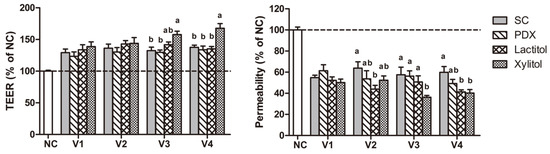 When compared with the negative control (growth medium without FCS and fermentation products), all fermentation products including that of SC alone significantly increased TEER (123–168%, p < 0.001) and decreased the paracellular permeability (36–64%, p < 0.001) of compromised E12 monolayers (Figure 3). The effects of PDX fermentation products on TEER and permeability did not differ from that of SC. Lactitol fermentation products increased TEER to an equivalent level compared with that of SC, but those from V2 and V4 resulted in lower permeability (p < 0.01). Xylitol fermentation products from V3 and V4 significantly increased TEER (p < 0.001) and decreased permeability (p < 0.01) compared with SC, and fermentation products from V4 led to highest TEER (p < 0.001) while that from V3 resulted in the lowest permeability (p < 0.05).