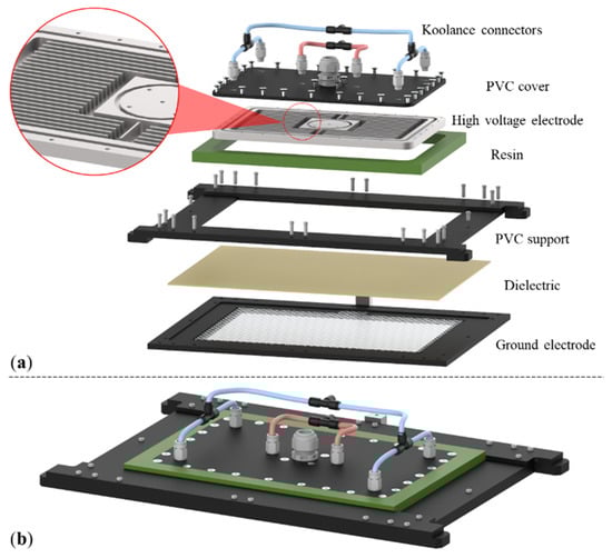 3D schematic of the SDBD plasma source used in the experimental activities: (a) exploded and (b) assembled views of the plasma source