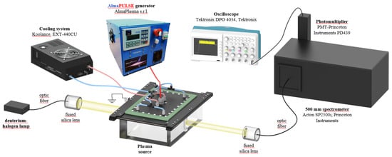 The setup for OAS is the same as that used by Simoncelli et al. [] and is schematically represented in Figure 2. A deuterium-halogen lamp, characterized by a broad band spectrum from UV to NIR radiation, was used as a light source. With the aim of investigating the plasma afterglow, the light beam was focused by means of optical fibers and fused silica lenses (50 mm of focus length) to achieve a parallel beam which passed under the mesh and was collected by a 500 mm spectrometer (Acton SP2500i, Princeton Instruments) to spectrally resolve the light beam in the UV, VIS, and near infrared (NIR) regions. The width of the inlet slit of the spectrometer was fixed at 50 µm for OAS acquisitions, and a grating with a resolution of 150 mm−1 was used. A photomultiplier tube (PMT, Princeton Instruments PD439) connected to a fast oscilloscope (Tektronix DPO40034) was used as detector, allowing fast acquisitions with a time resolution of 40 ms. The PMT amplification factor was kept constant for all acquisitions. In order to ensure identical initial conditions, the discharge chamber was opened and flushed for 30 s with fresh air prior to every measurement.