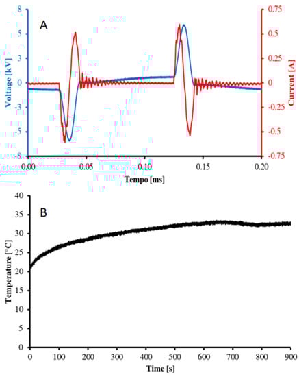 Voltage (blue) and current (red) waveforms (A) and gas temperature measurements during 900 s of discharge (B).