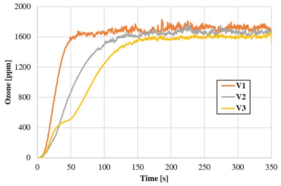 The kinetics of ozone generation obtained by varying the treatment volume are shown in Figure 4. At first, the ozone kinetics showed a continuous increase in O3 concentration over time; after reaching a maximum value, the concentrations remained constant until the end of the treatment. It must be highlighted that, while the O3 maximum values were almost the same for the different treatment volumes (~1700 ppm), the time needed to reach that maximum value was different for the three investigated cases. It can be noted that the larger the volume, the slower the maximum concentration was reached; moreover, larger volumes produced slightly lower concentration peaks. Finally, it must be underlined that using the larger volume created an anomalous trend during the initial 50 s of treatment; however, this phenomenon was observed in each repetition.