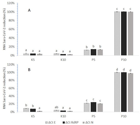 Percent reduction in SARS-CoV-2 RNA in terms of the three sequence targets investigated (E, RdRP, and N, represented respectively as light gray, black, and dark gray bars) in PP (A) and PET (B) samples treated for 5 (P5) and 10 min (P10), compared with their positive controls (K5 and K10). Different letters indicate significant differences among values related to the same packaging materials.