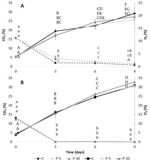 O2 (dotted lines) and CO2 (solid lines) concentration in the headspaces of PP (A) and PET (B) packages of fresh-cut apples subjected to 5 (P5) and 10 (P10) min of plasma exposure compared with the untreated ones. Different lowercase and uppercase letters indicate significant differences (p < 0.05) among O2 and CO2 values, respectively.
