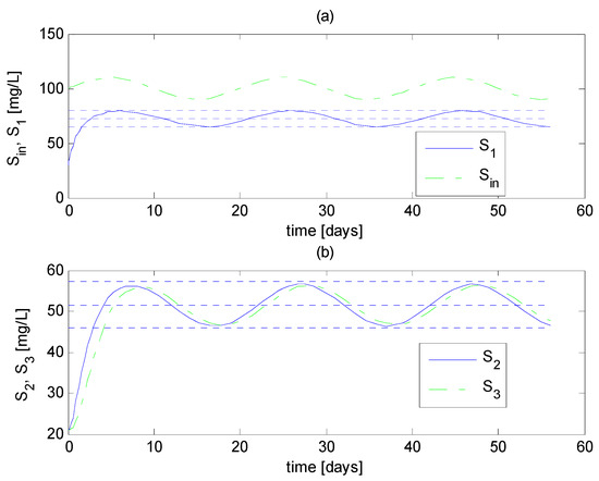 Also, the three simulation cases illustrate the results stated in Theorems 1 and 2: (i) the invariant nature of , stated in Theorem 1 and discussed in Remark 2: one can see that once S1 enters , it remains inside; (ii) the equivalence of the convergence regions and defined in Theorem 2: one can see that S2 and S3 converge to the same regions; (iii) the definitions of and , which indicate that and can be quite different, as depends on the reaction rate rx2: one can see this remarkable difference in the regions to which S1 and S2 converge; (iv) the invariant nature of , stated in Theorem 2 and discussed in Remark 6: one can see that once the three state variables are inside the convergence region , that is, , , , simultaneously, they remain inside afterwards.