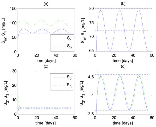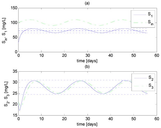 Remark 4. The presence of the third tank influences the transient value of , what can be noticed from Equation (111). However, it does not influence the width of the convergence region of the state , that is, [, ], since the bounds (, ) are not influenced by the parameters of the third tank, that is, and , which can be noticed from the definition of , (70), (71).