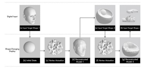 In contrast, a shape-changing display (SCD) can dynamically reconstruct digital information through physical changes, thus enabling real-time prototyping. The shape and volume of the SCD change by extruding the actuator. SCDs provide haptic feedback by transforming a shape through a combination of actuating pins that exert physical force. Thus, unlike conventional rapid prototyping and VR-based prototyping technologies, the SCD can construct a physical prototype in real time. In Iwata et al. [36], the visualization of a terrain using 16 actuators to create various 2.5D models with FEELEX has been discussed. Previous studies on SCDs have mainly used tabletop SCDs composed of a series of linear actuators extruding in a single axis and could reconstruct the shape of a surface. SCDs can be used in various applications and are compatible with numerous screen technologies. For example, various shapes can be reconstructed through the display [37], and texture mapping can be used to represent information on a display screen [38]. This demonstrates the potential of SCDs to deliver rich content without physical constraints. Existing state-of-the-art reports on SCDs highlight their numerous possible applications in human–computer interaction; however, tabletop SCDs have morphological limitations. For example, certain tasks are analogous to drawing a picture on a curved wall; however, 3D objects require a closed surface-based reconstruction method for morphological robustness.