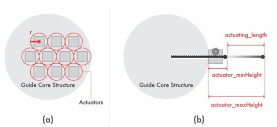 Assuming that the actuating pins have hexagonal packing, the dynamic range, that is, the rate of change of the total volume, can be calculated. (a) Example of hexagonal packing by calculating the range of influence of the actuating pins, depicted in circles; (b) boundary line (actuator_minHeight) at the minimum size, and the boundary line (actuator_maxHeight) at the maximum size.